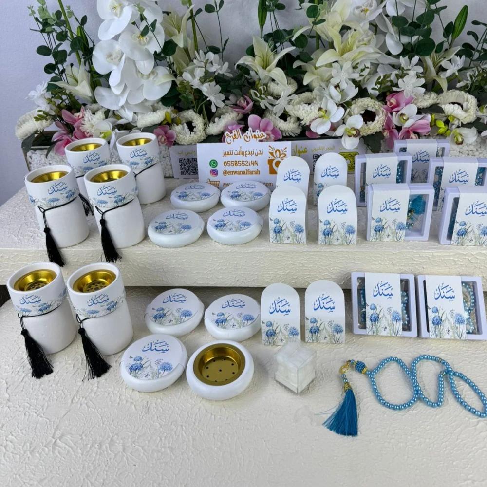 - المحتويات: 12 مبخرة، 12 عود، 12 مسك، 4 كروت طاولة، 12 قطعة ورقية، 6 تعليقات ماء، 1 تعليقة باب